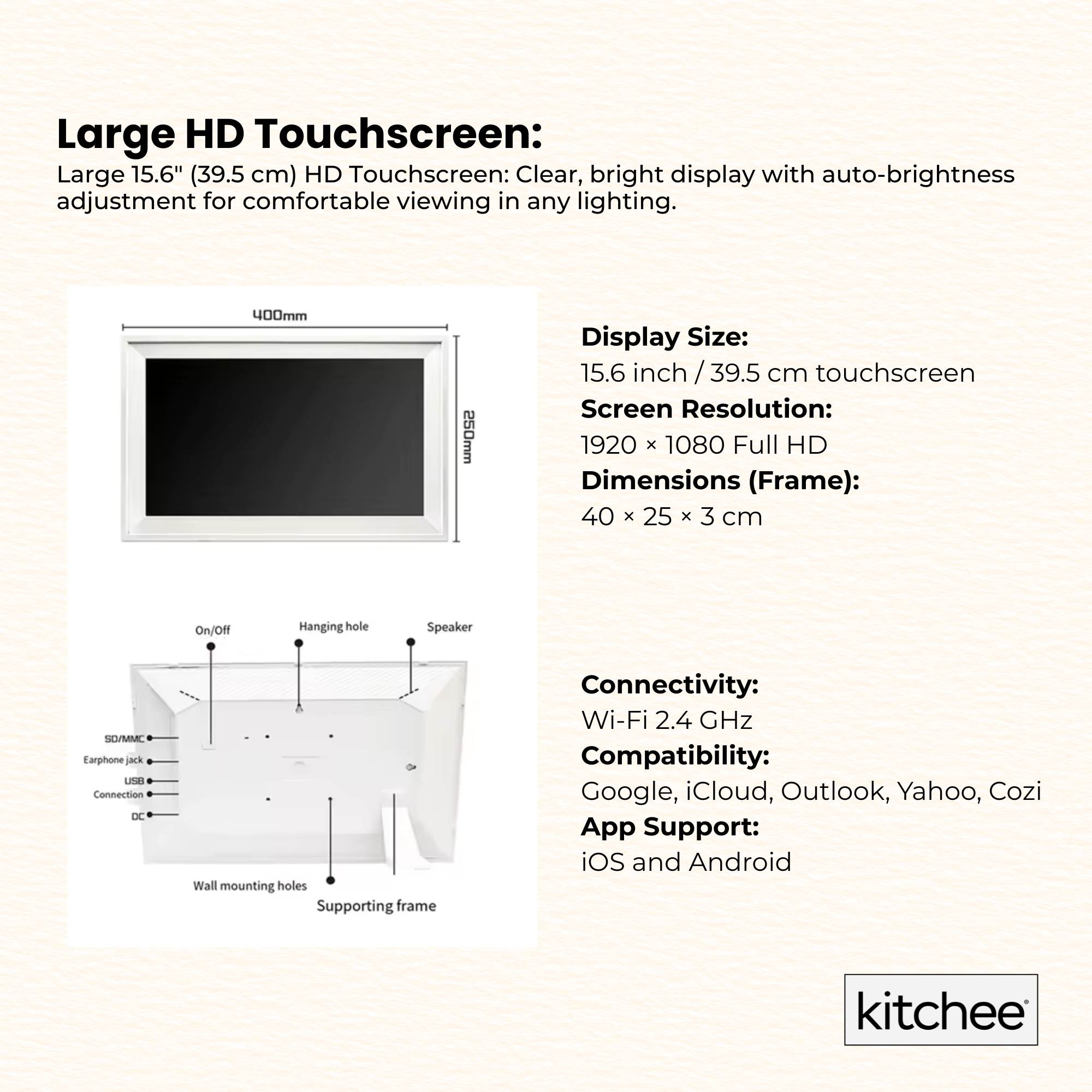 Kitchee Smart Digital Family Calendar is the all-in-one touchscreen planner that keeps your entire household in sync. Featuring a crystal-clear 15.6-inch (39.5 cm) HD display, this WiFi-connected device lets you view shared schedules, plan meals, manage chores, and sync calendars from Google, iCloud, Outlook, and more. Mount it on the wall or place it on your benchtop, it’s your digital family planning hub.